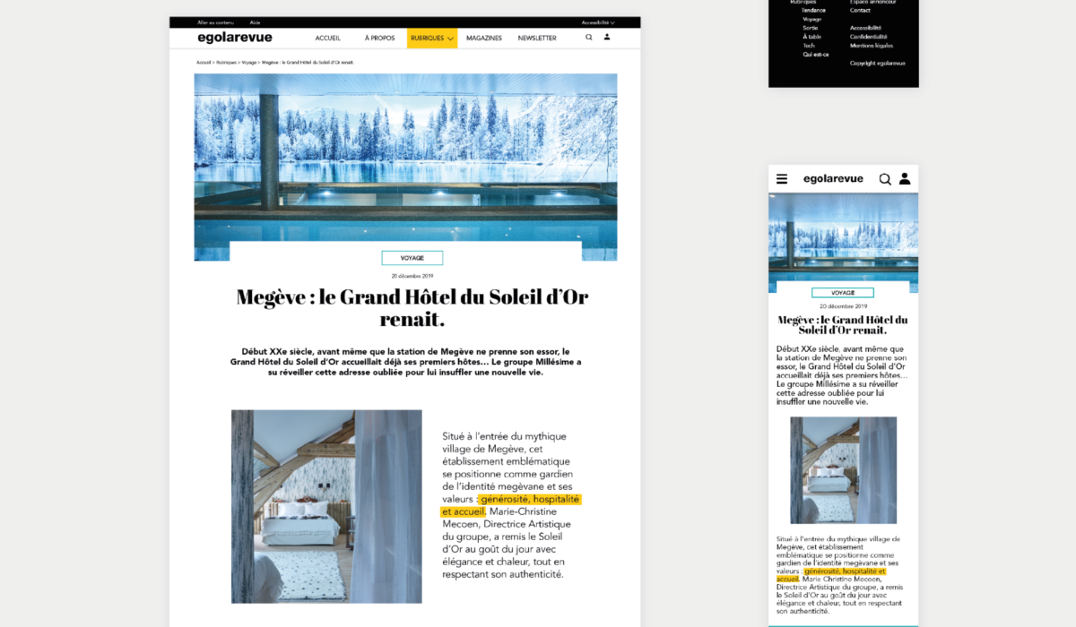 Egolarevue est un média (site internet et magazine) lyonnais qui existe depuis 10 ans. Il se revendique comme le magazine préféré des urbains, curieux, épicuriens et innovants. Au vu du contenu du site internet, la cible d’Egolarevue est plutôt CSP+ CSP++ de 30 à 45 ans. Le brief était de réaliser une refonte du site internet en 5 jours, avec plusieurs impératifs et objectifs. Parmi ceux-là, cibler une population plus jeune, de rendre le site plus accessible et de créer un lien entre le print et le digital. Un impératif était également de réaliser au moins 5 pages de ce site, en version desktop et mobile puis de prototyper les maquettes. Pour ce faire, je suis passée par plusieurs étapes : analyser le site existant, créer un persona et un parcours utilisateur. A partir de ce parcours, j’ai ensuite réalisé un zoning puis wireframe de mes pages afin de pouvoir réaliser les maquettes et le prototypage sur Adobe XD et Invision. Pour répondre à ce brief, j’ai joué sur le rythme de la structure de mes pages ainsi que sur les couleurs.